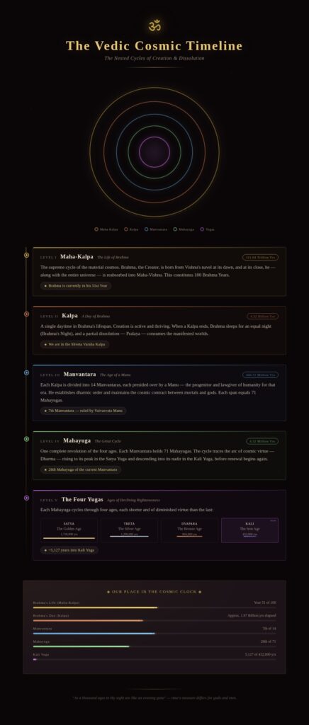 The Vedic Timeline Vedic The Vedic TimelineTo understand the Vedic timeline, it is best to look at it as a "nested"…Dr. Rishi KumarFebruary 28, 2026